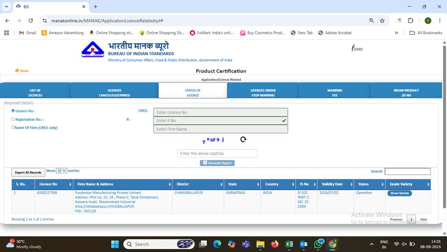 | BIS Certificate Number | CM/L- 6200237598 |