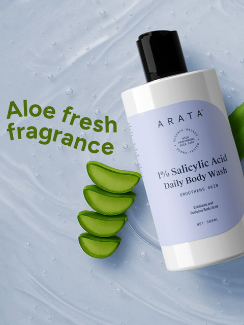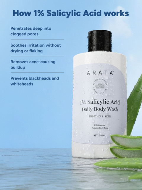 The Arata 1% Salicylic Acid Daily Body Wash is a gentle yet effective formula specially designed for those dealing with body acne, clogged pores, or rough skin texture. It contains 1% salicylic acid, which helps exfoliate dead skin cells, clear out pores, and prevent breakouts—making it ideal for daily use. The formula lathers well, feels light on the skin, and rinses off easily without leaving dryness or irritation. It has a mild, refreshing scent and is free from sulfates, parabens, and harsh chemicals. With regular use, it noticeably smoothens the skin and helps reduce bumps, making it perfect for both acne-prone and sensitive skin types.