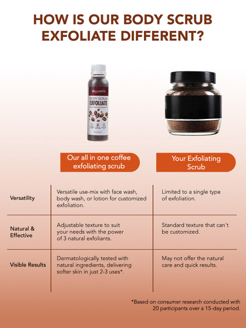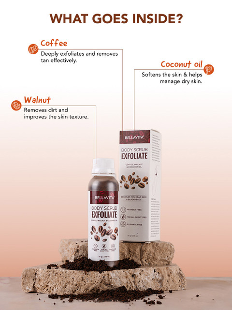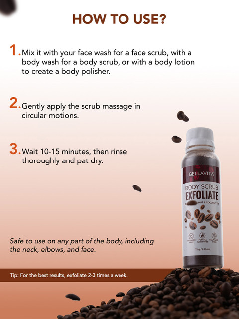 I’ve tried the Bellavita Body Scrub Exfoliate, and it’s absolutely amazing! 🌟 This scrub smells divine, like fresh coffee beans mixed with a hint of coconut. The texture is just right – not too coarse, not too fine – making it perfect for exfoliating without irritating the skin. The blend of coffee, walnut, and coconut oil works wonders for my skin. It leaves my skin feeling incredibly soft, smooth, and rejuvenated. The coffee and walnut particles gently scrub away dead skin cells, while the coconut oil moisturizes and nourishes.