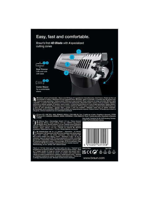 | Special Features | Shave, trim and edge with one tool: all-in-one electric razor and beard trimmer for men. Easy, fast and comfortable in every stroke, even in tricky areas. For face (1, 2, 3 mm combs).4D-Blade technology: one blade with 4 cutting elements, consisting of 2 side trimmers and 2 central shaving zones–making 450 movements per second. Shaves close enough to look great, while staying gentle on skin.Built to last longer: this trimmer and shaver's stainless steel 4D-Blade stays sharp for up to 6 months.Skin protection: this trimmer and shaver uses a caged blade design to protect your skin even in tricky areas.Get quick and precise results with the pivoting Flex head, which adapts to your facial contours–particularly useful in tricky areas. Shave intuitively: up, down, back or forwards.Designed for precision and control: trim both up and down with the two-way comb. Safely shave wet or dry thanks to the rubberized, anti-slip handle.Fully waterproof |