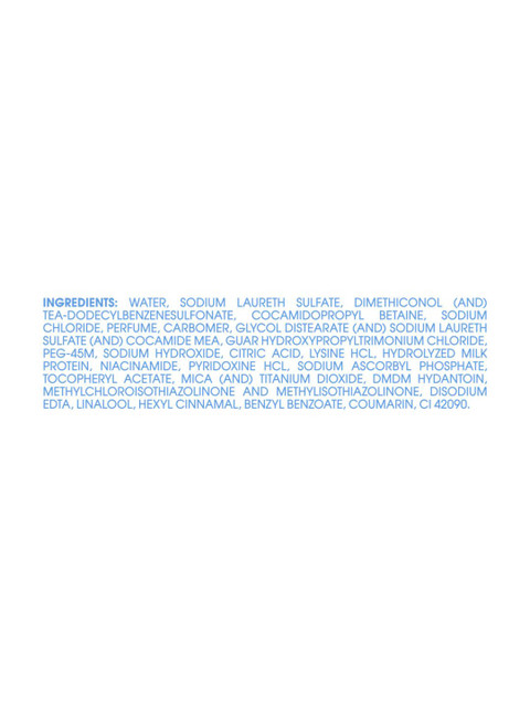 | Ingredients | Milk Protein: Proteins and lipids in milk work to strengthen hair, while the calcium promotes hair growth and aids in preventing hair loss.Full Ingredients: Water, Sodium Laureth Sulfate, Dimethiconol (And) Tea-dodecylbenzenesulfonate, Cocamidopropyl Betaine, Sodium Chloride, Perfume, Carbomer, Glycol Distearate (And) Sodium Laureth Sulfate (And) Cocamide Mea, Guar Hydroxypropyltrimonium Chloride, Peg-45m, Sodium Hydroxide, Citric Acid, Lysine Hcl, Hydrolyzed Milk Protein, Niacinamide, Pyridoxine Hcl, Sodium Ascorbyl Phosphate, Tocopheryl Acetate, Mica (And) Titanium Dioxide, Dmdm Hydantoin, Methylchloroisothiazolinone And Methylisothiazolinone, Disodium Edta, Linalool, Hexyl Cinnamal, Benzyl Benzoate, Coumarin, Ci 42090 |
