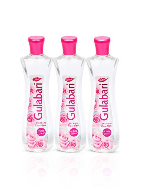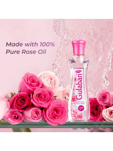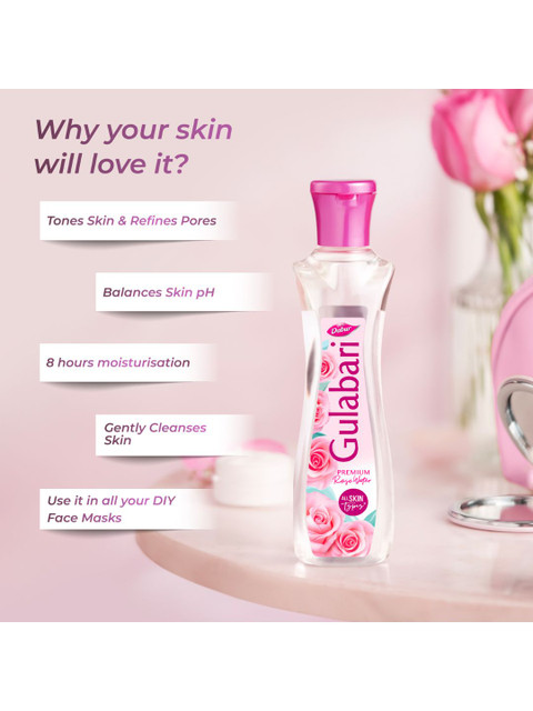 | Benefits | Invigorate, refresh and cleanse your skin with the goodness of natural rose extracts.Dabur Gulabari Rose Water is a natural toner that cleanses your skin from deep within ridding it of any dirt, grime or foreign bodies that can damage your skin.Apply it directly on the skin or mix it with a face pack to get a glowing &, radiant rose like skin.Dabur gulabari rose water with the goodness of rose essence is worthy to be your daily skincare saviour.Rosewater provides immense benefits to the skin, keeping it radiant, acne-free, and youthful by acting as a gentle non-alcoholic skin toner.It also purifies the skin, protects it from bacterial infections, removes make-up and dirt and stimulates skin circulation.It also maintains the ph balance of the skin, and offers calming effect on acne. |