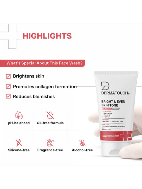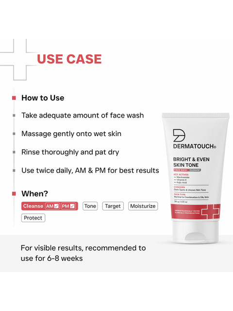 I have been using the Dermatouch Bright & Even Skin Tone face wash for a few weeks now, and I am really happy with the results. The texture is very lightweight and gentle on the skin. It cleans well without making my face feel dry or tight, which is perfect for daily use.