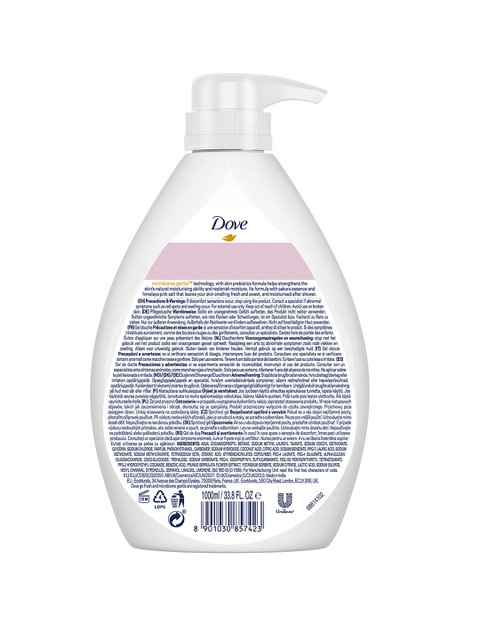 All For And From Nature: Dove keeps its promise to care for you and our nature as well. Our products are certified PETA Cruelty-Free, and our bottles are made of recyclable plastic.Dove Body Wash range contains gentle cleansers and is thus ideal for daily skincare routine.Not Just A Body Wash, It's A Moisturizer Too: Dove Sakura Blossom Go Fresh Body Wash is a nourishing body wash that helps cleanse your body and moisturize too. No more cleansing and then moisturizing because Dove Body Wash does it at once.Microbiome Gentle For Gentle Care: Infused with microbiome gentle, a skin prebiotics formula, this moisturizing mild shower gel deeply nourishes your skin while also strengthening the skins natural moisture barrier.Indulge Yourself In Self-care With rich, creamy lather and a sweet, elegant scent of Sakura, Dove Body Cleanser indulges you in a replenishing shower experience while leaving your skin softer, smoother, and glowing.Naturally Derived Essence: Enriched with the essence of Sakura &amp, Himalaya Pink Salt to give your skin the needed nourishment. While Sakura helps repair damaged skin and brighten skin tone, the Himalaya Pink Salt helps restore hydration to the skin.Gentle &amp, Effective: Made with the goodness &amp, care of nature, Dove Body Wash reaches deep into the skin to wash out impurities and hydrate skin from within, giving the skin a refreshing feel. Your confidence lies in you. Pamper it well.