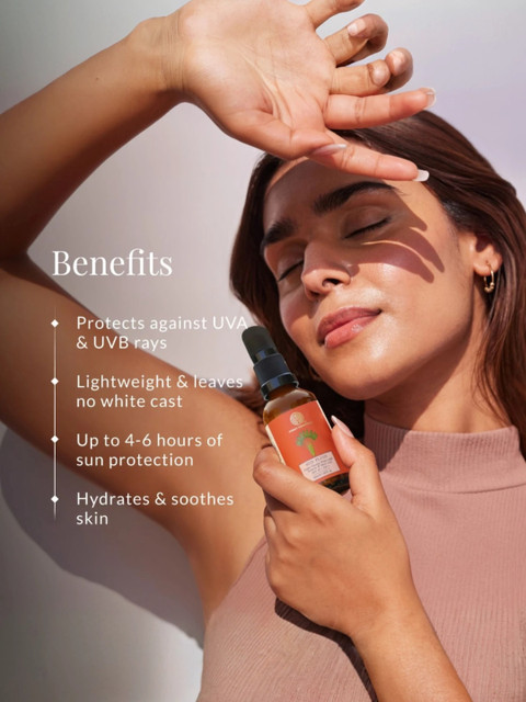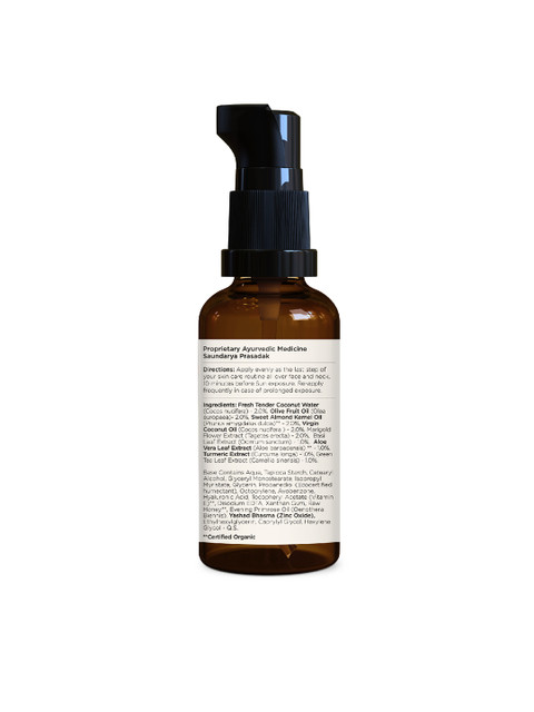An SPF 50 PA++++ sunscreen with an ultra-lightweight, sheer texture for intensive sun protectionMade with tender Coconut Water, fresh Basil leaves and cooling Aloe Vera, the mineral sunscreen gives your face a sheer glowEasily absorbed with a lightweight texture, the sunscreen glides smoothly onto your skin and disappears within seconds, leaving your face dewy with no white castAn Ayurvedic formula that uses Natural Zinc (Yashad Bhasma), one of the safest forms of sunscreen that minimizes the effect of the harsh UVA/UVB sun raysIt is blended with natural humectants to keep the skin hydrated and moisturisedFree from chemicals, parabens and petrochemicals