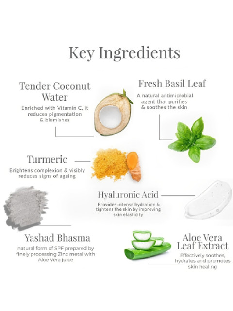 Aloe Vera, Hyaluronic Acid, Marigold, Natural Mineral Zinc Oxide, Tender Coconut Water, Turmeric