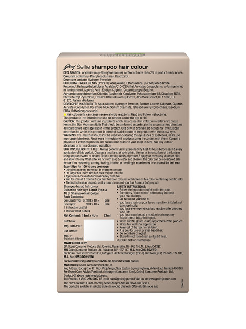 | Ingredients | Colourant: Aqua (Water), Ethanolamine, p-Phenylenediamine, 2,4-Diaminophe- noxyethanol HCI, Resorcinol, Cocamidopropyl Betaine, Polyquaternium-53, Hydroxyethylcellulose, N, N-Bis (2-Hydroxyethyl)-p-Phenylenediamine Sulphate, m-Aminophenol, Acrylates/C10-30 Alkyl Acrylate Crosspolymer, Ascorbic Acid, Sodium Sulphite, Acrylamidopropyltrimonium Chloride, Acrylamide Copolymer, Phenyl Methyl Pyrazolone, Disodium EDTA, Emblica officinalis (Amla) extract, Aloevera liquid extract, Parfum (Perfume), CI 11680, CI 61570.Developer: Aqua (Water), Hydrogen Peroxide, Sodium Laureth Sulphate, Glycerin, Acrylates Copolymer, Cocamide MEA, Sodium Stannate, Tetrasodium Pyrophosphate, Disodium EDTA, Orthophosphoric acid. |