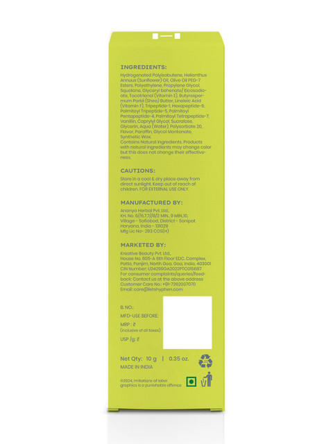 रिव्यू: यह Hyphen Peptide Lip Balm सच में बहुत अच्छा है। यह होंठों को बहुत Hydrating महसूस कराता है और सबसे अच्छी बात यह है कि यह बिल्कुल Non-sticky है। इसकी Fragrance (पीच वाली) बहुत ही रिफ्रेशिंग और हल्की है। डेली इस्तेमाल के लिए यह एकदम परफेक्ट है!