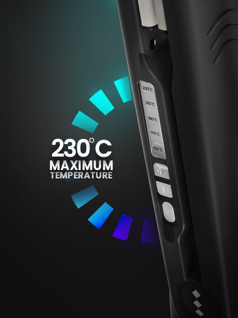LED display with adjustable temperature range from 150 C to 230 C. Professional PTC Heater and Dual Ceramic Heaters for immediate heat up and rapid heat recovery. Bevelled Edges for straightening, styling, and volumising. Auto adjustable floating plates to provide full contact across the entire plate surface for easy glide styling with no gaps or pulling