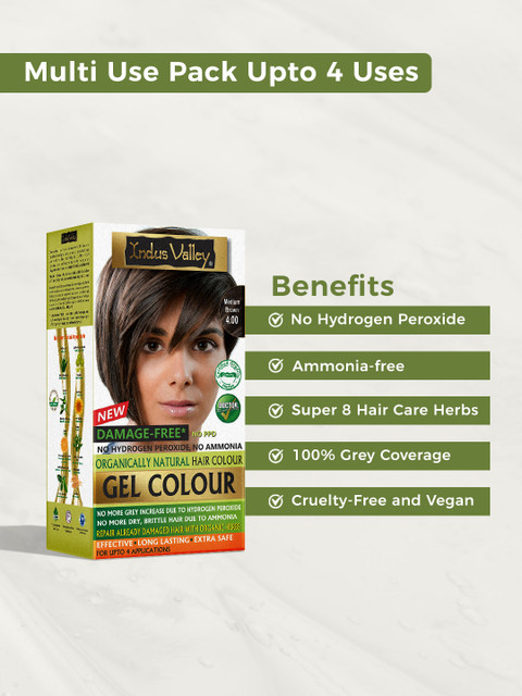 Indus Valley Medium Brown Gel Colour is composition of 8 natural herbs which gives natural colour lighter than Black along with that helps in removing hair problems like spilt ends, dandruff, hair fall, Indus Valley Medium Brown Gel Colour does not contain any PPD, No Ammonia, No Hydrogen Peroxide, No Heavy MetalNatural herbs like Henna, jojoba oil, Sunflower not only gives you colour but also the fragrance of orange