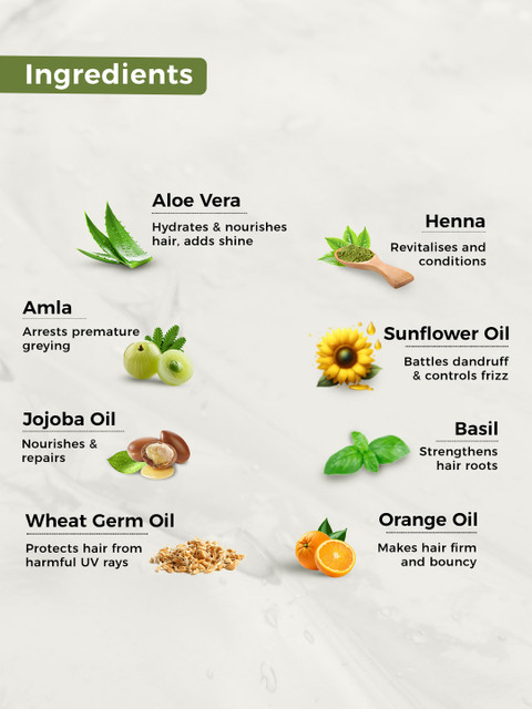 sunflower, organic basil, wheatgram oil, jojoba oil, honey comb, organic henna, orange, aloe-vera, organic amla.