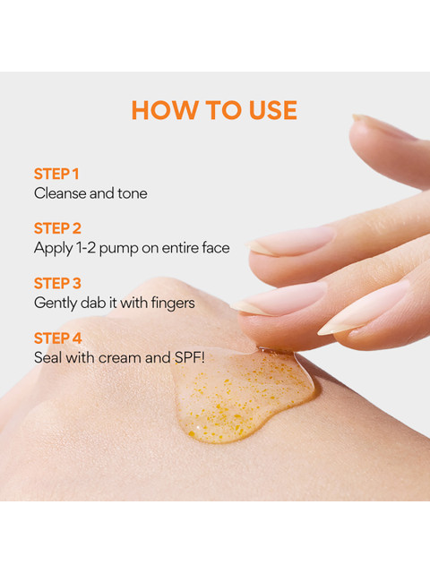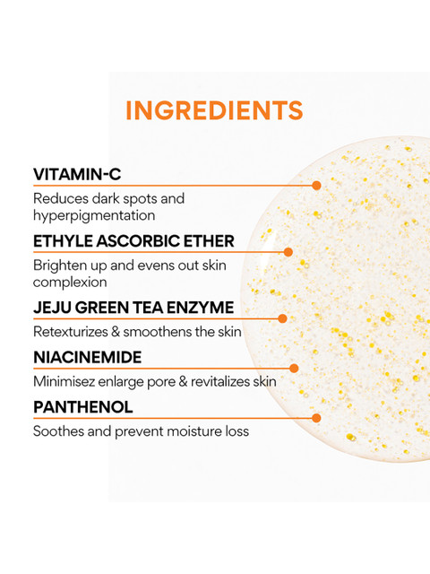 | Ingredients | Vitamin C: Reduces dark spots and hyperpigmentationEthyle Ascorbic Ether: Brighten up and evens out skin complexionJeju Green Tea Enzyme: Retexturizes &, smoothens the skinNiacinamide: Minimisez enlarge pore &, revitalizes skinPanthenol: Soothes and prevent moisture lossFull Ingredients List WATER, AQUA, EAU, PROPANEDIOL, GLYCERIN, 1,2-HEXANEDIOL, 3-O-ETHYL ASCORBIC ACID, BETAINE, ERYTHRITOL, BUTYLENE GLYCOL, LACTOBACILLUS FERMENT LYSATE, SQUALANE, HELIANTHUS ANNUUS (SUNFLOWER) SEED OIL, ACRYLATES/C10-30 ALKYL ACRYLATE CROSSPOLYMER, DEXTRIN, XANTHAN GUM, TROMETHAMINE, GLUCONOLACTONE, CITRUS RETICULATA (TANGERINE) PEEL EXTRACT, PANTHENOL, CARNOSINE, NIACINAMIDE, ALLANTOIN, HYALURONIC ACID, CAPRYLIC/CAPRIC TRIGLYCERIDE, DAUCUS CAROTA SATIVA (CARROT) ROOT EXTRACT, PENTYLENE GLYCOL, SODIUM METAPHOSPHATE, SILICA DIMETHYL SILYLATE, TOCOPHEROL, ETHYLHEXYLGLYCERIN, CYCLODEXTRIN, MADECASSOSIDE, ASCORBYL TETRAISOPALMITATE, SALIX ALBA (WILLOW) BARK EXTRACT, DIPOTASSIUM GLYCYRRHIZATE, PROTEASE*, TRANEXAMIC ACID, GLUTATHIONE, ACHILLEA MILLEFOLIUM EXTRACT, SODIUM HYALURONATE, BETA-CAROTENE, FERULIC ACID, HYDROLYZED HYALURONIC ACID, SODIUM HYALURONATE CROSSPOLYMER, SODIUM ACETYLATED HYALURONATE |