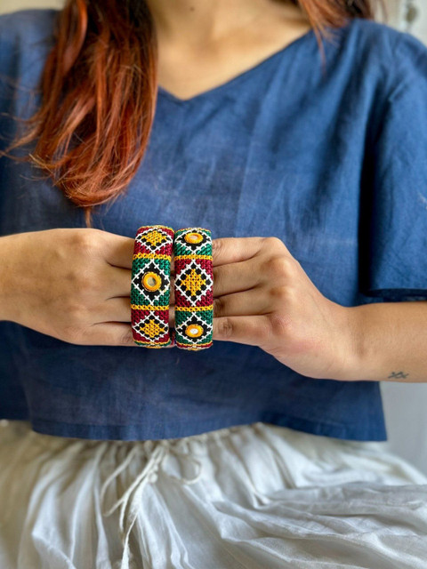 Set of 2 green, maroon & white bangles, each has embroidered with mirror details, secured with slip-on closure