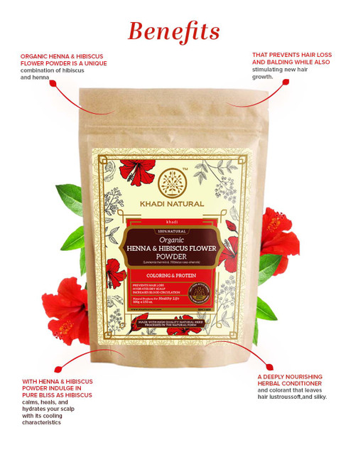 Organic Henna &amp, Hibiscus Flower Powder adds silkiness and gloss to your hair,making itsoft and manageableHibiscus decreases heat and increases blood circulation in the scalp, which helps to prevent premature greying and hair thinningFor almost 5 weeks,long-lasting coverage with a deep-toned color