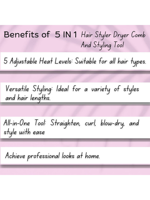 5 in 1 Multi-Functional Tool combines hair dryer, straightener, curling barrel, volumizer, and massage comb in one versatile styling device.Create curls, waves, straight looks, and voluminous blowouts quickly and safely with salon-like finish.Advanced Heat Technology – Even heat distribution with tourmaline ionic care reduces frizz, protects hair, and adds natural shine.Suitable for All Hair Types – Adjustable heat levels make it ideal for fine, thick, curly, or straight hair, ensuring smooth results.User-Friendly, Portable, Lightweight &amp, ergonomic design with detachable heads for easy to use, clean, and carry while traveling.