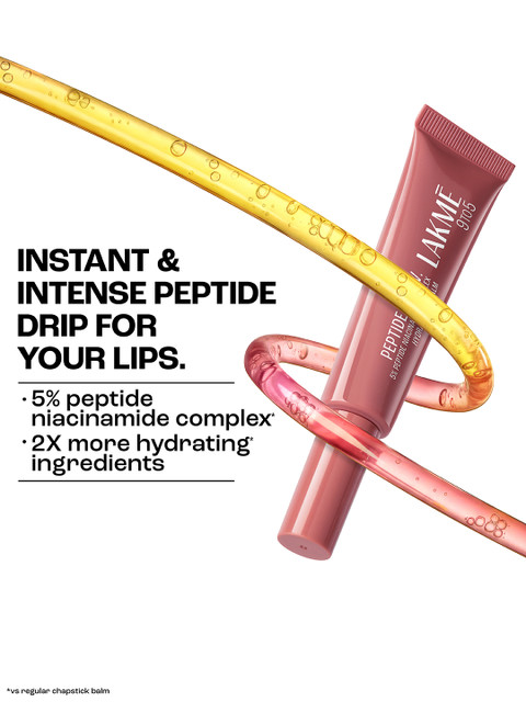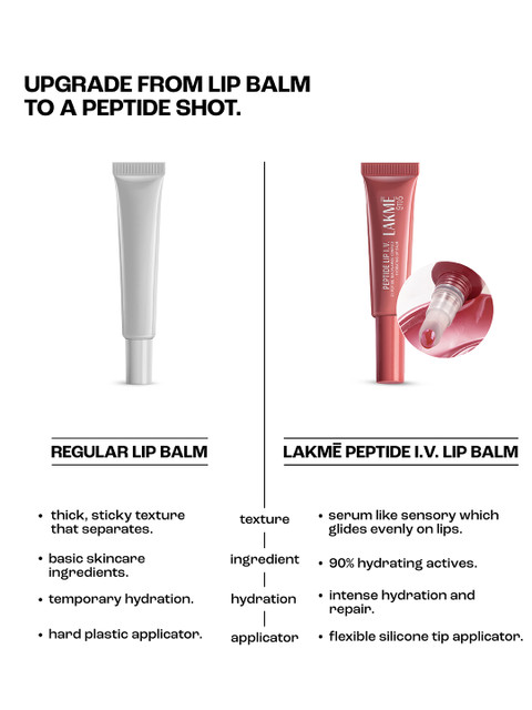| Special Features | PEPTIDE I.V. TREATMENT: Infused with 5% Peptide + Niacinamide complex, this Lakme lip balm deeply hydrates, repairs, and supports the lip barrier for healthier lips.INSTANT PLUMP EFFECT: Hyaluronic Acid in this lip balm visibly plumps lips, reduces flakiness, and delivers a serum-like texture for smooth, soft lips.DEEP MOISTURE BOOST: Enriched with shea butter organic and a tri-blend of butters, this balm locks in long-lasting hydration for non-flaky, nourished lips.LUXURIOUS APPLICATION: The soft silicone applicator ensures an even, mess-free glide with a serum-like texture, offering a luxurious lip care experience.VERSATILE SHADES: Available in four shades–Bare Minimum Hydration, Peptalk Pink, Brown Lip Retreat, and OG Overnight Achiever–for every mood and occasion.COLLAGEN SUPPORT: Helps boost collagen for fuller-looking lips while restoring moisture and supporting the lip barrier for soft, healthy lips. |