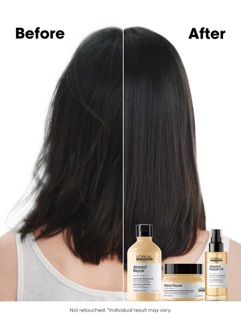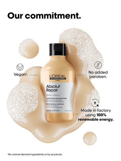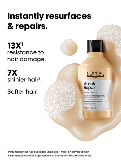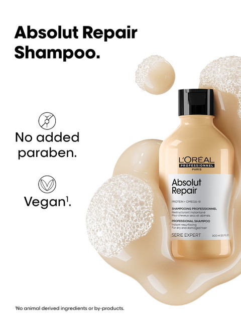 | Special Features | Expert nourishing shampoo to repair and hydrate damaged hairPowered by Protein and Omega-9, the L'Oreal Professionnel Serie Expert Absolut Repair nourishing hair shampoo helps repair damaged hairIt nourishes and strengthens the hair fiber leaving hair feeling soft and hydratedFor best results use with the Absolut Repair hair maskAnti-damage and dryness to instantly resurface and repair hairProvides 13x resistance to hair damage, while leaving it with a lightweight touchAlso get 7x shinier and softer hairThe Absolut Repair range is powered by Protein, Omega-9, that repairs and stregthens hairIt helps to resurface and seal cuticles maintaining hydrationThe daily anti damage professional routine consists of a shampoo, mask, serum for effective damage repairIt nourishes and strengthens the hair fiber leaving hair feeling soft and hydratedApply a bottle cap sized amount of shampooLather until a rich foam is obtained and then rinse thoroughlyFor best results use with the Absolut Repair hair mask, Absolut Repair 10-in-1 Oil Multi Benefit Hair Serum |