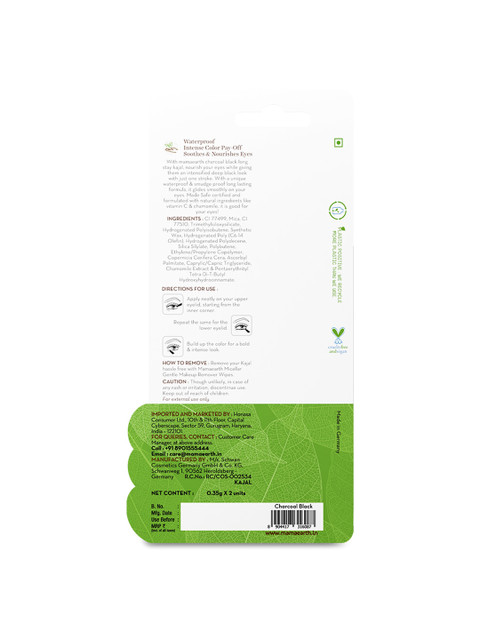 | Special Features | 11 hour long stay: make way for deep, dark intense black color with sharp definition that stays on and on. Mamaearth charcoal black long stay kajal glides effortlessly and stays on for 11 long hours.Smudge-proof and waterproof:sweat or rain, the kajal wont smudge or budge. Get the perfect waterproof stroke every day. This kajal is just what you need for those perfect intense eyes.Vegan and made safe certified: mamaearth charcoal black long stay kajal is vegan, ophthalmologically tested, and made safe certified, giving your eyes both color and care.Made with natural ingredients: made using natural ingredients like vitamin c &, chamomile, the kajal is free from sulfates, parabens, sls, petroleum, artificial preservatives &, colors.Suitable for all skin types: this kajal is ophthalmologically tested, made safe certified &, is suitable for all skin types. " |