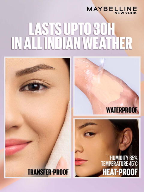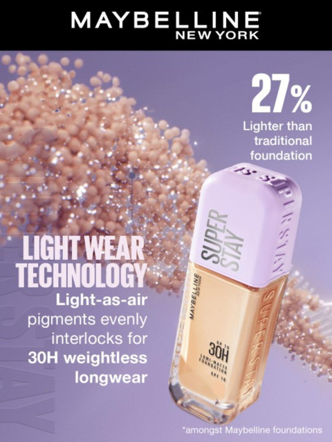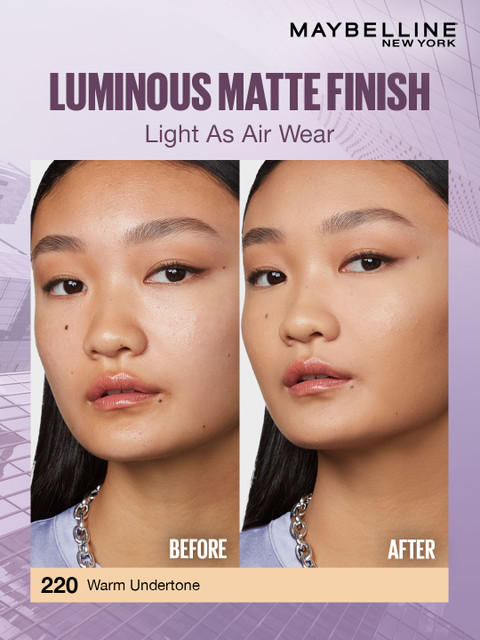 Achieve a flawless matte yet luminous base that lasts for up to 30 hours with the New Maybelline New York Super Stay Lumi Matte Foundation.The Light-As-Air long-lasting foundation comes in a weightless liquid formula and offers buildable medium to full coverage.Fueled by its Lightwear technology, this is the airiest Maybelline foundation that brings a uniquely lightweight feel with a luminous yet matte glow, giving you a soft, diffused glow.The Maybelline New York Super Stay 30H Lumi Matte comes in 6 shades and is dermatologically tested, allergy tested, vegan, and non-comedogenic, making it suitable for dry skin and combination skin types.LIGHT AS AIR FOUNDATION: Meet Super Stay Lumi Matte Foundation. Longwear now goes light-as-air, thanks to our airiest foundation that defies it all. Weightless &amp, comfortable on the skin 27% said it feels lighter than the normal foundations of MNY foundations based on an instrumental test.30-HOUR LONG WEAR IN ALL INDIAN WEATHER. Get a flawless base that stays for up to 30 hours. This Foundation is Transfer Proof &amp, Sweat Proof, so no need for touch-ups. It is a sweat-proof foundation that resists transfer through sweat, rain &amp, heat – no caking, no patchiness, and no flatness.BUILDABLE TO FULL COVERAGE: Super Stay Lumi Mattes' new Lightwear technology brings a uniquely weightless feel to Longwear foundation. It offers medium to full buildable coverage, so pick your coverage. No caking and no patchiness.GIVES A LUMI MATTE FINISH: Achieve a matte finish with a touch of soft glow with this innovative foundationSUITABLE FOR ALL SKIN TYPES: Ideal for all skin types – dry skin, combination skin. It is also non comedogenic &amp, allergy tested.Vegan &amp, dermatologically tested.