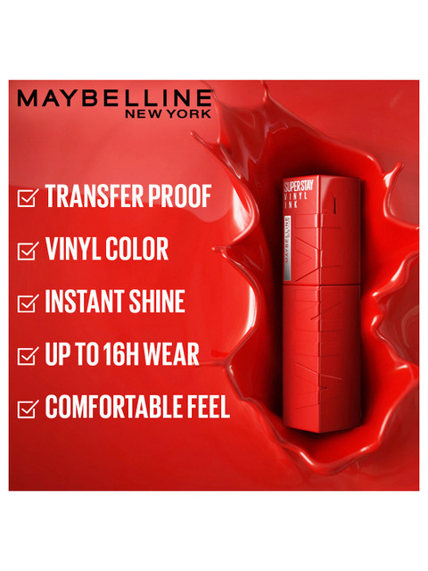 | Benefits | Shake up your longwear with Super Stay Vinyl Ink. This Liquid Lipcolor delivers no-budge saturated vinyl color and up to 16HR wear.Its color lock formula defies smudging and transfer.Swipe the formula across your lips and enjoy an instant shine and all day color.Available in 10 original vinyl shades and 5 Rogue Rose Target Exclusive shades inspired by the bold and edgy attitude of NYC.From poppy brights to saturated red tones and even the perfect everyday neutrals, express yourself with Maybelline longwear lipcolor. |