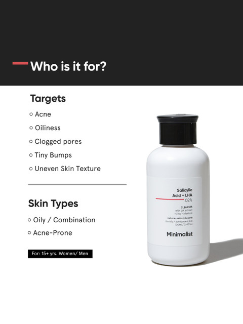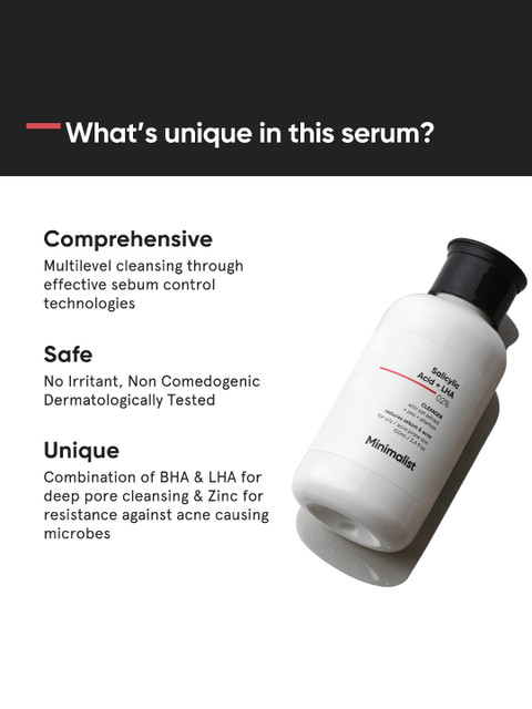 Multi-level cleansing: formulated with capryloyl salicylic acid (lha), which stays on outer layer of skin and provides gentle exfoliation, revealing soft skin, while salicylic acid penetrates deep into pores and reduces sebum and oil production.This salicylic acid and lha combination provides multi-level cleansing unlike other salicylic acid face wash.Sulphate-free, non drying: compared to traditional face wash this is formulated with very mild sulfate-free surfactants (cleansers) that provide optimum cleaning along with several hydrating &, soothing ingredients like panthenol (vitamin b5) for hydrating overall after-feel.Anti acne: boosted with anti-bacterial zinc and salicylic acid that effectively controls oil production and acts as a potent anti acne (or pimple) active.Reduces acne and prevents future breakout for clear-looking skin.Clean &, transparent beauty: formulated at ph 4.5 – 5.5 with high purity grade salicylic acid by merck, Germany a leading global supplier.For combination to oily skin type: unlike traditional facewash BHA exfoliant are best for combination to oily skin types especially acne-prone or sensitive skin. also, lha offers a gentle, cell-by-cell exfoliation without any irritation. formulated for both men and women.This Salicylci Acid + LHA based face clenaser prevents Acne, controls Oil &, reduces open pores by providing multi-level cleansing without drying out your skin.