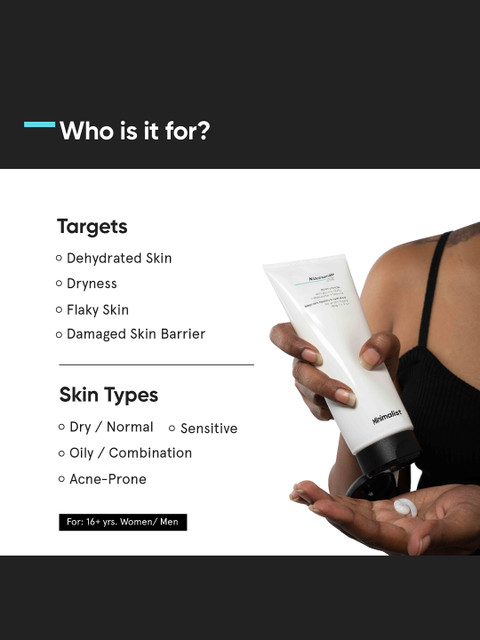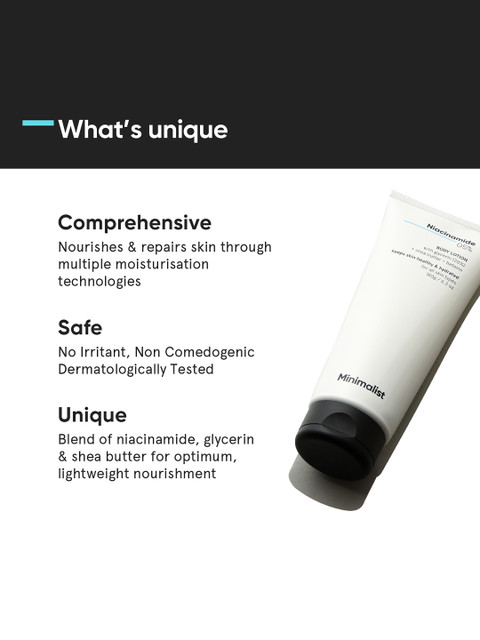 Dermatologically TestedNiacinamide: known to help in synthesis of natural skin barrier thereby providing protection against oxidative stressGlycerine: one of the well known agents for hydration which also helps in moisture retentionBetaine: hydrates and soothesReduces sun damageFormulated with Niacinamide which repairs &amp, strengthens barrier and reduces UV damageBoosted with Glycerine &amp, Shea butter which has properties of hydration &amp, retention of moisture in the epidermal layer of the skinAnti-inflammatory &amp, anti-microbial benefits