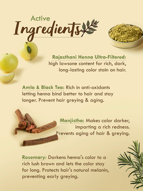 Pure rajasthani henna, amla, shikakai, triphala, manjistha, bhringraj, rosemary and black tea