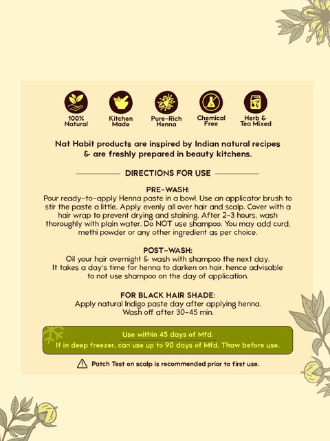 Pre-Wash:Pour ready-to-apply Henna paste in a bowlUse an applicator brush to stir the paste a littleApply evenly all over hair and scalpCover with a hair wrap to prevent drying and stainingAfter 2-3 hours, wash thoroughly with plain waterDo not use shampooYou may add curd, methi powder or any other ingredient as per choicePost-Wash:Oil your hair overnight &amp, wash with shampoo the next dayIt takes a day's time for henna to darken on hair, hence advisable to not use shampoo on the day of applicationFor Black Hair Shades:Apply natural Indigo paste day after applying hennaWash off after 30-45 min