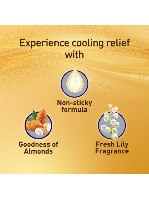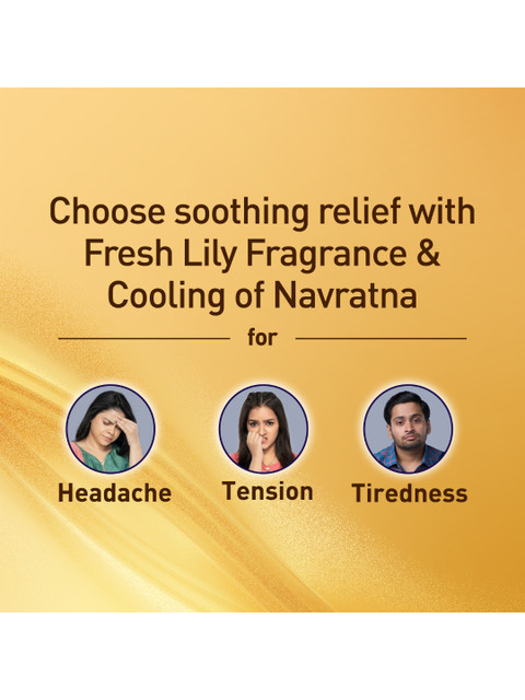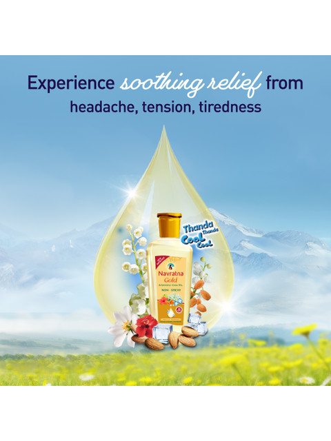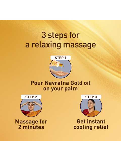 Goodness of almond: Almond oil is known to nourish and strengthen your hair, making it smooth, shiny and vibrant.Mild fragrance: Infused with an exotic mix of natural floral notes which helps relieve tension and uplifts the mood.Relieves headache: A genttle massage with this oil helps relieve headache and fatigue, and offers a relaxing effect.Non-sticky: Has a non-sticky texture for a pleasant experience.With Navratna Gold, experience the unparalleled cooling sensation of the world's No.1 cooling oil and uncover a relaxing and rejuvenating solution that has captured the hearts of millions across.Navratna Gold Cool Oil, a distinctive fusion of nine essential herbal oils, including invigorating mint, soothing camphor, and refreshing eucalyptus. Renowned for their cooling and therapeutic properties, this blend is celebrated for its unmatched quality, effectiveness, and widespread user satisfaction.Infused with a refreshing fragrance inspired by the Lily's, Navratna Gold Oil offers a sensory delight, soothing tension, and promoting relaxation with its calming effect on the scalp and forehead.It is enriched with the nourishing Goodness of Almond, it nourishes and strengthens hair, leaving it luxuriously smooth, shiny, and vibrant.Navratna Gold Cool Oil's unparalleled success and widespread popularity position it as a trusted companion for providing relief from everyday stress, promoting relaxation, and enhancing overall well-being