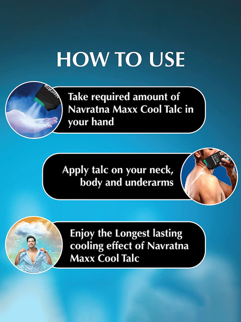 Take required amount of the talc in your handApply talc on your neck, body and underarmsEnjoy the longest lasting cooling effect of the talc