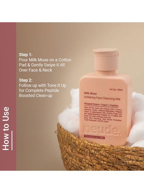 Pour neude milk muse face cleansing milk on a cotton pad to remove all the sweat, dullness &amp, stress off, for deeply cleansed, soft skinFollow up with a serum and/or moisturizer. Top up with sunscreen during the day. use am &amp, pm.