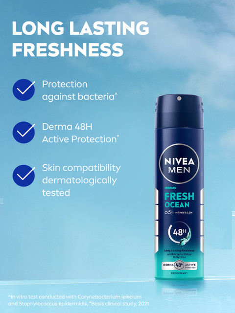 Nivea Fresh Ocean Deo delivers a clean, aquatic scent that’s refreshing yet subtle—perfect for daily wear. It offers dependable freshness (many users report 6–10 hours of protection), though shorter than the 48-hour claim . The spray is even and light, dries quickly without leaving any residue on skin or clothes