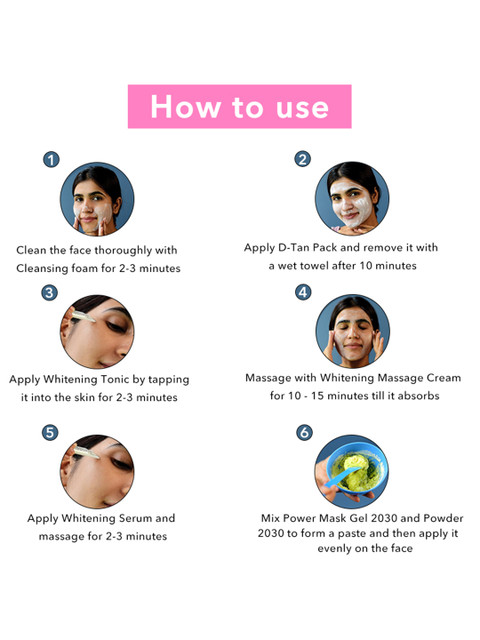 | How-to-Use | Clean the face thoroughly with Cleansing Foam followed by D-tan pack for tan removal.Apply whitening tonic and wait for 5 min. Apply massage cream and rub until full absorption.Mix 2030 Gel and Powder and apply on face. Remove after 10 minutes.Put few drops of whitening serum and let it adsorb.Mix Arbutin Serum and Powder and apply on face. Remove after 10 minutes.Massage Whitening Cream SPF 30 at the end. |