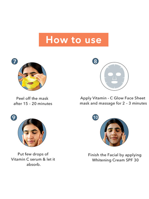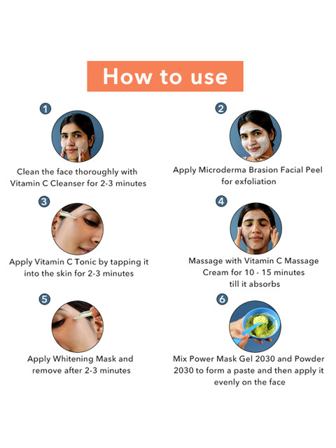 Clean the face thoroughly with Vit-C cleanser followed by micro-dermabrasion scrub for exfoliation.Apply Vitamin C tonic on the face followed by the massage cream and wait for 7-10 minutes for absorbing.Mix 2030 Gel &amp, Powder and apply on face. Remove after 10 min.Put few drops of vit-C serum and let it absorb.Put Vitamin-C Sheet Mask and remove after 10 minutes.Apply SPF 30 Cream for complete facial protection.
