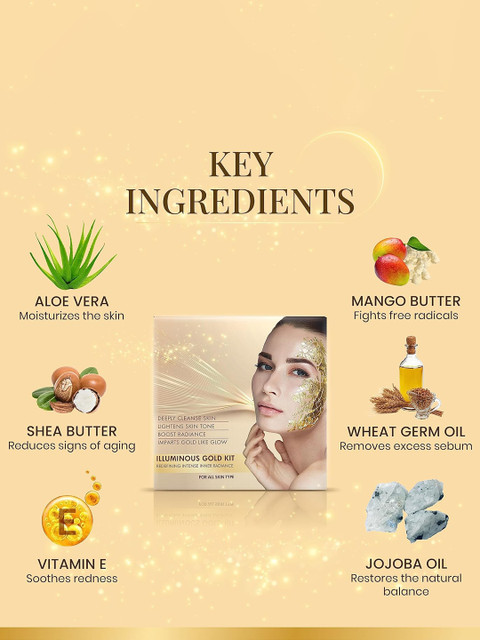 Improves skin luminousity: this facial kit helps to enhance the natural golden glow. Skin illuminates with a flush of health, energy &amp, nutrients while feeling soft &amp, nourished.Reduces scars &amp, spots: it maintains optimal health of the skin by replenishing it with crucial nutrients. The kit helps in cleaning pores deeply and removing skin irregularities.Organic ingredients: the blend of ingredients like aloe vera, mango butter, shea butter &amp, vitamin e helps to protect skin from external impurities like dirt, uv rays &amp, sun damage &amp, provide naturally balanced &amp, spotless skin.Treats dull &amp, dehydrated skin, regulates sebum (oil) production, treats acne &amp, acne scars, reduces blackheads &amp, whiteheads;Reduces skin damage. Indicated for: dull &amp, dehydrated skin. Suitable for all skin types.No Synthetic FragranceNo Toxic ChemicalsOrganically Cultivated HerbsNo Synthetic ColorsPlant Based ProductsParaben &amp, Mineral Oil FreeCruelty – Free