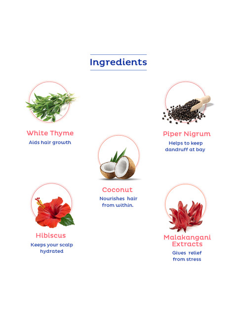 | Benefits | White Thyme:Â Aids hair growthCoconut:Â Nourishes hair from withinMalakangani Extracts:Â Gives relief from stressPiper Nigrum:Â Helps to keep dandruff at bayHibiscus:Â Keeps your scalp hydrated |