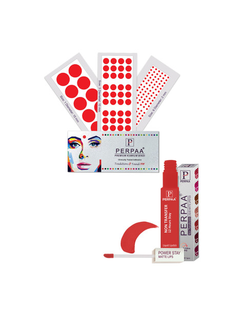 PERPAA Power Stay Non Transfer Lipstick-01 & Set of 3 Premium Red Bindis – Size 01,03,09