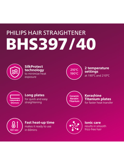 | Special Features | Keratin ceramic plates for smooth gliding and shiny hairIonic care for shiny, frizz-free hairFast heat-up time, ready to use in 60 secHandle lock: YesStorage hook: YesSwivel cord: YesIonic care: YesKeratin ceramic coating: YesPlate lock: YesTemperature Settings: 190degC and 210degCWarranty: 2 years Warranty provided by brand/manufacturer |