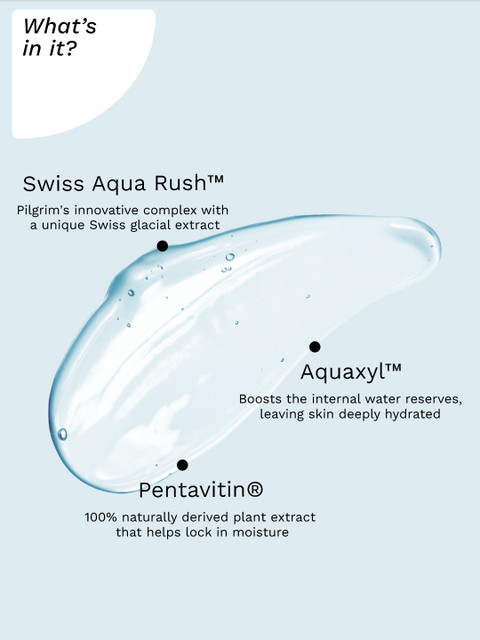 Swiss Aqua Rush:Long-lasting hydrationRehydrates from within-plumps and energizes skinPentavitin:Locks in moistureOffers deep moisturizationKeeps skin youthfulAquaxyl:Boosts hydration elementsBuilds moisture reservoirStrengthens skin barrier