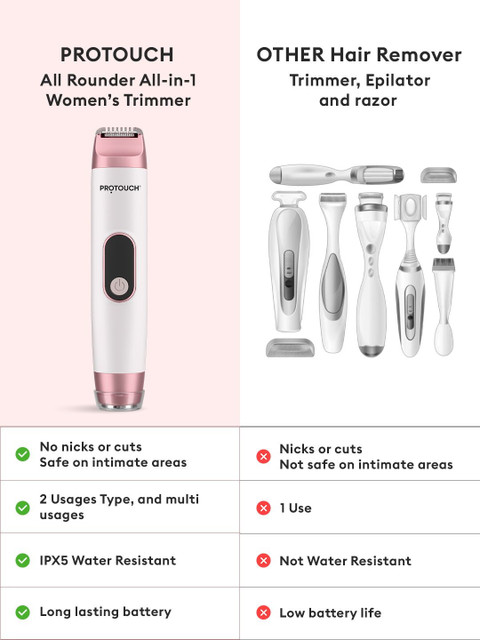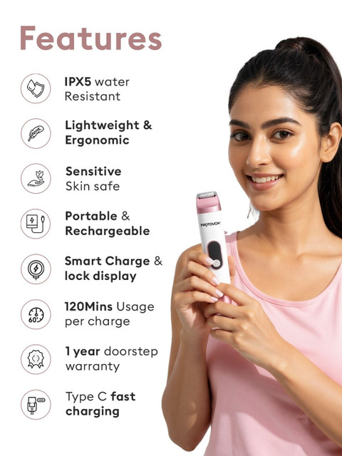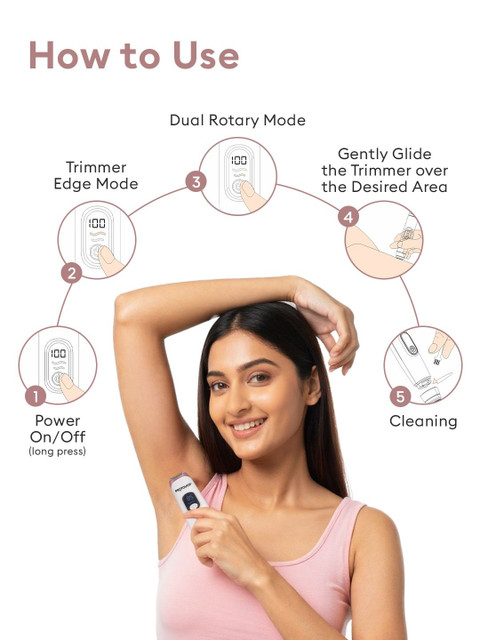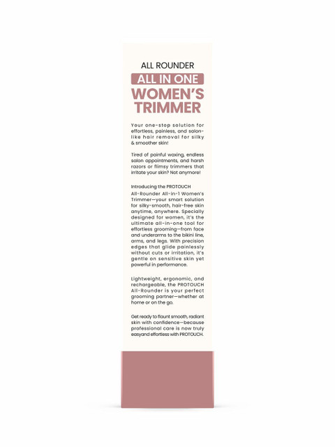 | Special Features | 1. All-in-1 Full Body GroomingDesigned for face, arms, legs, underarms, and bikini line, this trimmer replaces multiple hair removal tools. Perfect for everyday touch-ups and full-body grooming without irritation.2. Painless &, Sensitive Skin SafeFeatures skin-friendly precision blades that remove hair without cuts, redness, bumps, or ingrown hair. Ideal for women with sensitive skin who want a smooth finish without discomfort.3. Rechargeable &, Cordless ConvenienceComes with a USB rechargeable battery, offering cordless use for easy handling. No need to constantly replace batteriesjust charge and use anytime, anywhere.4. Lightweight, Portable &, Travel-ReadyCompact and ergonomic, this trimmer fits effortlessly into a purse, travel pouch, or vanity kit. Your perfect grooming companion at home, office, or while traveling.5. IPX5 Water Resistant for Easy CleaningSafe for wet and dry use, the IPX5 water-resistant design makes it simple to rinse and clean the trimmer after use, ensuring hygiene and long-term durability.6. Fast, Gentle &, Smooth Hair RemovalEffortlessly glides over the skin to remove both fine and coarse hair with quick, quiet, and painless performance, leaving skin smooth and salon-fresh. 7. Safe Alternative to Waxing &, Razors: No more painful waxing, skin burns, darkening, or razor cuts. Get professional results at home with no irritation or salon appointments. |