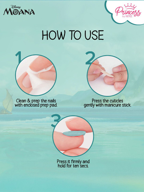 Stick On Nails (Island Magic &amp, Island Adventure): Clean and prep the nails with enclosed prep pad. Buff the nails with nail buffer.Peel-off the paper at the back and press on firmly.Hold it in place for 10 seconds.Princess by RENEE Disney Moana Beachy PeachyLip Balm: Start applying from the center of the lips moving outwards all along, apply whenever the lips feel dry.