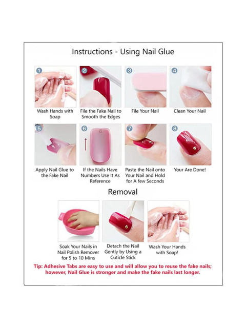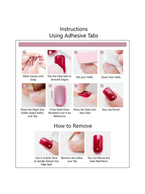 | How-to-Apply | Clean and prep the nails with enclosed prep pad.Buff the nails with nail buffer.Peel from paper backing and press on firmly.Hold in place 10 seconds. |