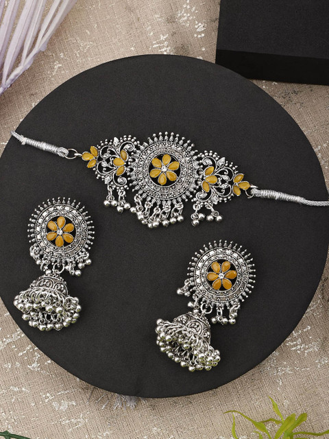 Silver-toned choker necklace, has yellow artificial stones studded details