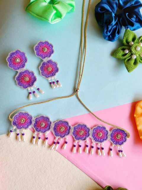 Purple, pink and gold-toned floral boho bridal tasselled necklace, gold-plated, has artificial beaded details