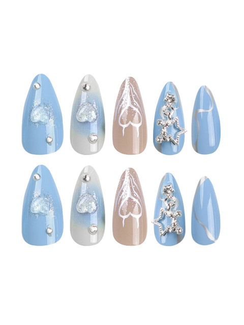 Secret Lives Set Of 24 Glossy 3D Heart Stud & Accessories Design Artificial Nails – Blue