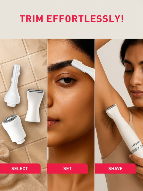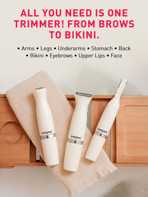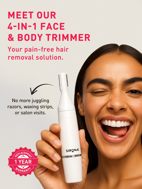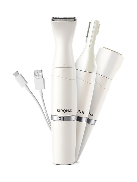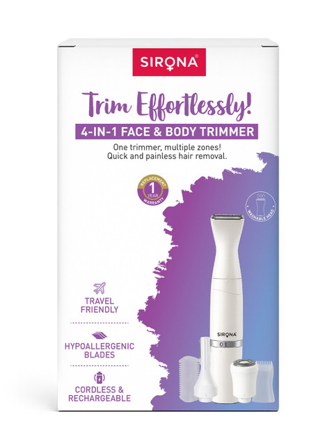Say goodbye to multiple tools and painful salon visits!The Sirona 4-in-1 Face & Body Trimmer is designed for women who want effortless, full-body grooming without irritation or nicks. Its hypoallergenic stainless steel blades glide smoothly across your skin, offering gentle and precise trimming for your face, arms, underarms, legs, bikini line, and more.This cordless and rechargeable trimmer runs for up to 90 minutes, giving you the freedom to groom on your own schedule, whether at home or on the go. The washable head ensures easy cleaning, while the sleek, travel-friendly design makes it your perfect companion for every trip.