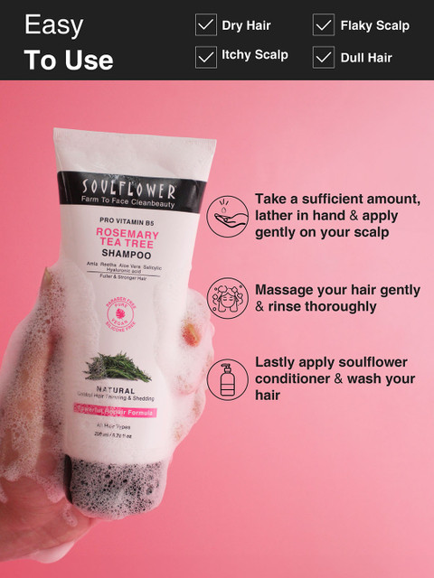 Take Coin Sized amount of Soulflower Rosemary Tea Tree Shampoo, and apply it on damp hair from the roots to the ends.Massage it in gently and rinse it off with lukewarm water.Lock in the moisture with Soulflower Conditioner for Soft and Shiny Hair.