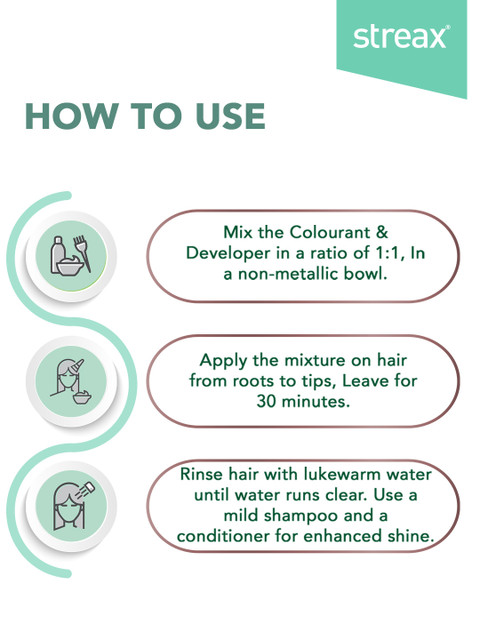 | How-to-Apply | Mix the colorant and the developer in a non-metallic bowl. Follow the instruction manual inside the box.Apply the mixture to dry hair.Leave for 30 minutes. Rinse the colored hair with till the water runs clean &, apply Streax Ultra Shine Conditioner. |