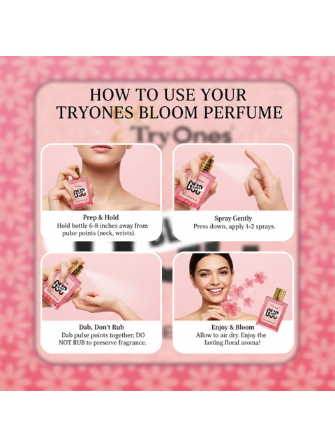 | How-to-Apply | Prep &, Hold: Hold the bottle 6-8 inches away from pulse points (neck, wrists).Spray Gently: Press down to apply 1-2 sprays.Dab, Don't Rub: Gently dab pulse points together;Â do not rub to preserve the fragrance.Enjoy &, Bloom: Allow to air dry and enjoy the lasting floral aroma |