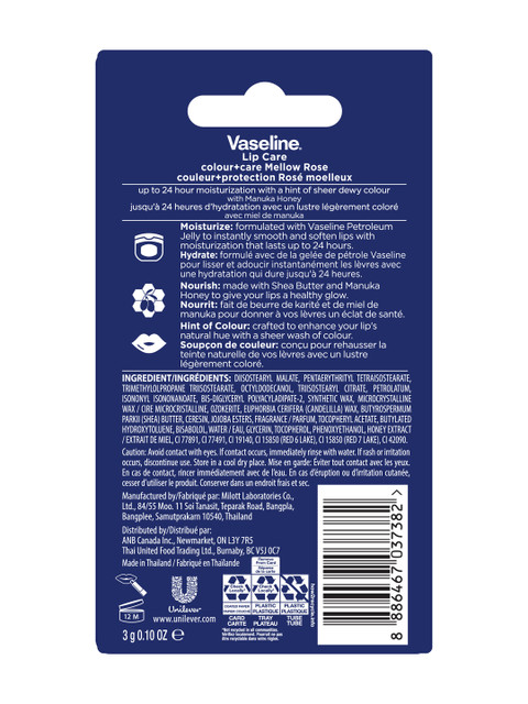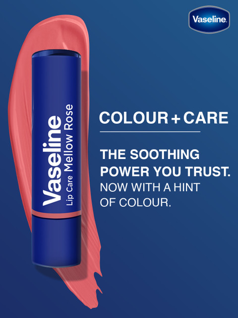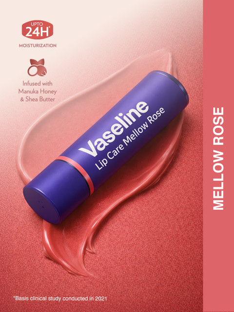 Vaseline Mellow Rose Colour+Care Lip Balm is infused with Vaseline Petroleum Jelly, Shea Butter, and Manuka Honey to keep lips smooth and nourished for up to 24 hours.It adds a delicate rosy tint while enhancing the lips' natural glow.Natural